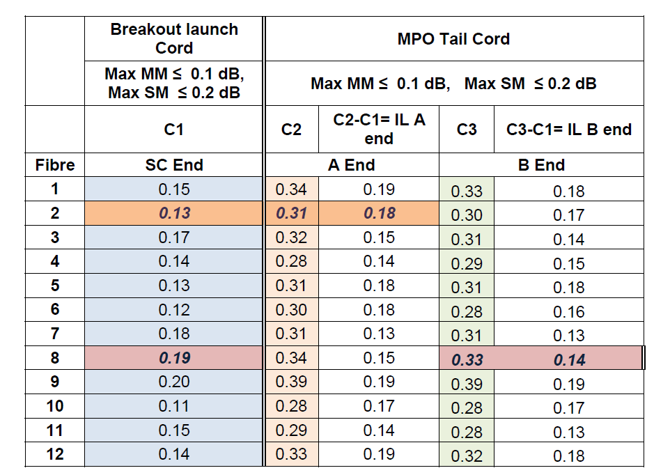 13.计算“ B”端MPO连接的配对损耗。 C3-C1。