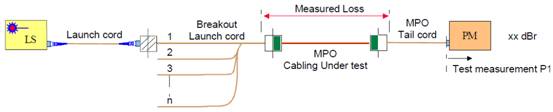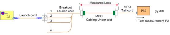 4.保持清洁,将测试延长线穿过光纤2到n,并测量IL。请勿断开MPO TC的连接。